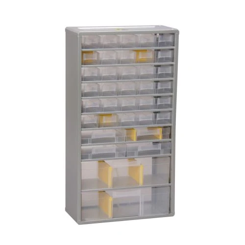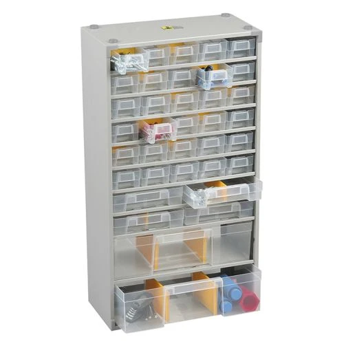 Ce casier métallique à tiroirs VarioPro de la marque Sori fait partie des coffres à outils multi-usage de cette marque. Il dispose de 36 tiroirs et de 16 séparateurs et peut être accroché au mur ou gerbé aisément grâce à ses moulures et nervures de renforcement.