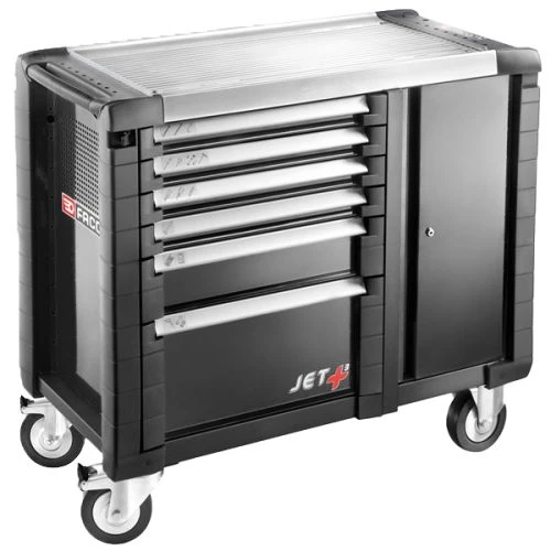L’établi mobile Jet+ de Facom possède une soute à grand volume pour un rangement des outils encombrants. Pour plus de sécurité, les tiroirs et la soute sont fermés par une clé identique. La servante est compatible avec la gamme d’accessoires Jet+ et JET.XL.