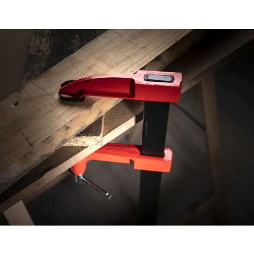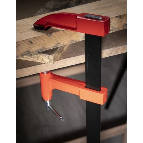 Serre-joints à pompe avec frein de blocage. Protections plastiques aux mors, valet et coulisseau en fonte GS, protégés époxy.